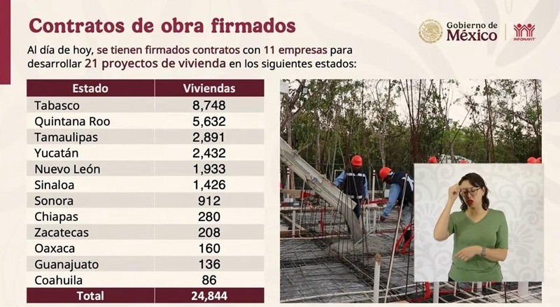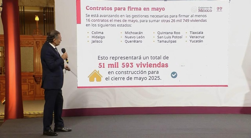 Agregó que se avanza en las gestiones para firmar 16 contratos y sumar otras 26 mil 749 viviendas en 12 estados, entre los que también se incluye Tamaulipas, lo que representará un total de 51 mil 593 viviendas al cierre del mes de mayo.