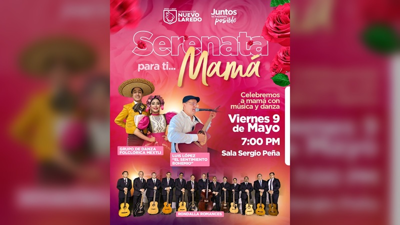 NUEVO LAREDO, TAMPS. El Gobierno Municipal de Nuevo Laredo invita a todas las familias a celebrar a lo grande el ‘Día de las Madres’ con “Serenata para ti… mamá”, un evento especial que se llevará a cabo este viernes 9 de mayo a las 7:00 de la tarde en la Sala Sergio Peña.