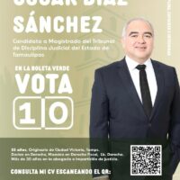 Aquí en Tamaulipas también habrá de integrarse y votarse este primero de junio el Tribunal de Disciplina Estatal, donde en la boleta Verde con el número 10 aparecerá el abogado Oscar Díaz Sánchez, también con vasta experiencia en este campo de supervisión judicial.