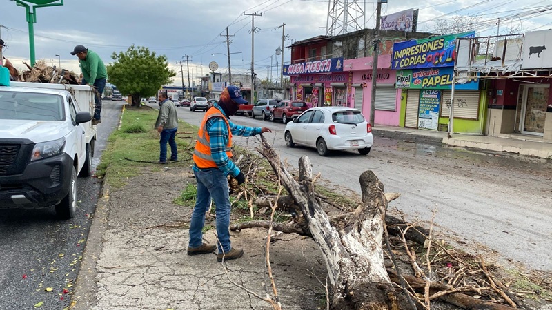 Cuadrillas de trabajadores recorren distintos sectores para restaurar el daño ocasionado por el paso del frente frío número 42 que, con fuertes ráfagas de viento e intensa lluvia, ocasionó la noche de este jueves inundaciones mínimas en algunas vialidades.