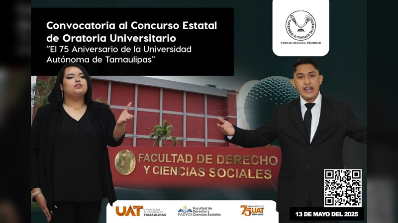 CIUDAD VICTORIA, TAMPS. La Universidad Autónoma de Tamaulipas (UAT) celebrará, el próximo 13 de mayo, el Concurso Estatal de Oratoria Universitario, organizado por la Facultad de Derecho y Ciencias Sociales del Campus Tampico (FADYCS) con motivo de celebrar el 75 aniversario de la fundación de la máxima casa de estudios del estado.