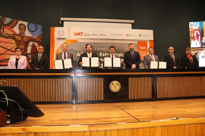 TAMPICO, TAMPS. Con el propósito de fortalecer los procesos formativos y elevar la competitividad académica, el rector de la Universidad Autónoma de Tamaulipas (UAT), Dámaso Anaya Alvarado, presidió la firma de alianzas estratégicas con organismos internacionales especializados en certificación y desarrollo académico.