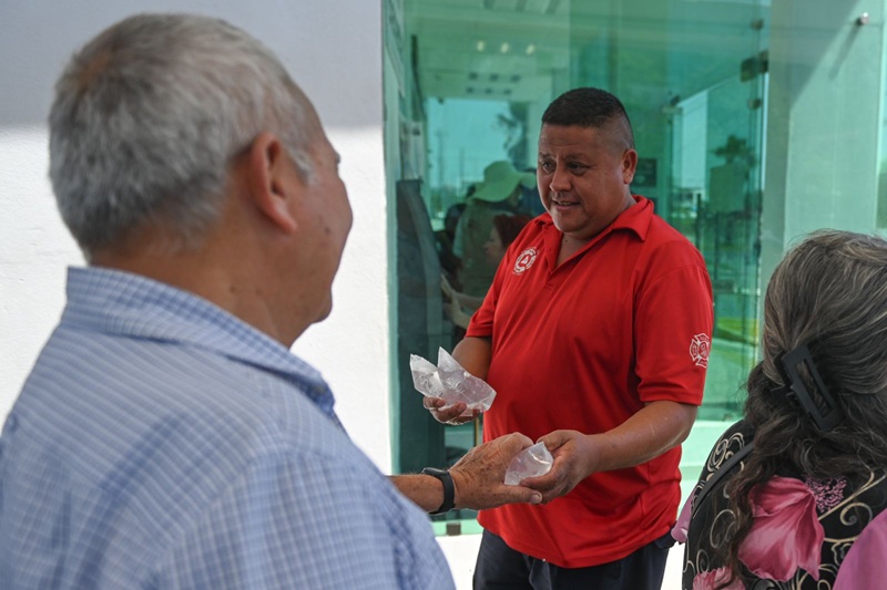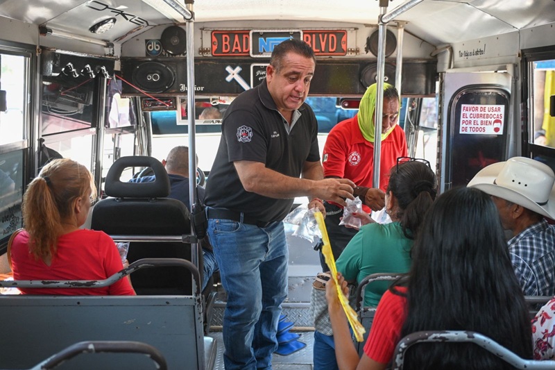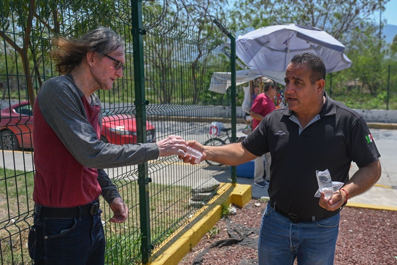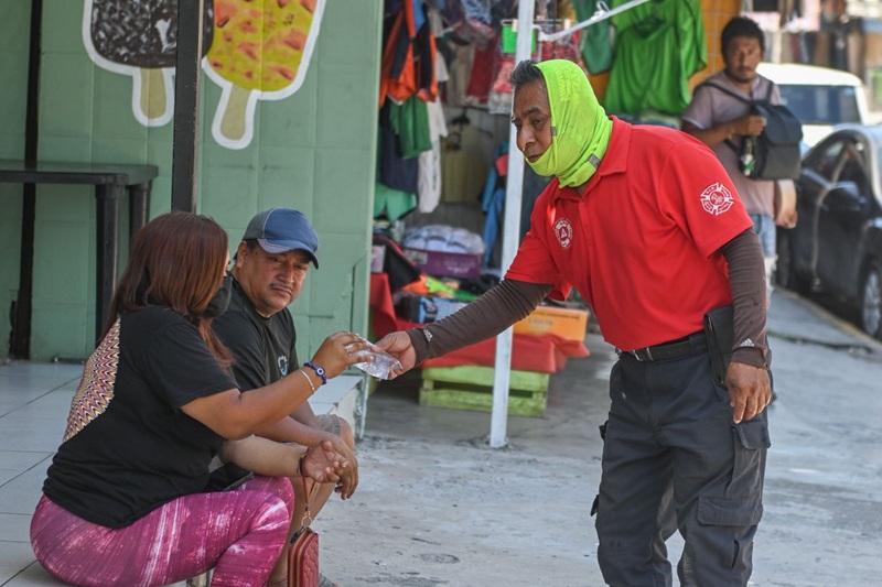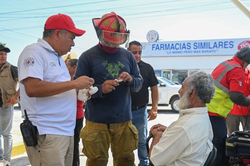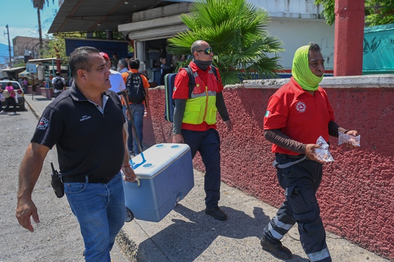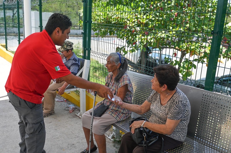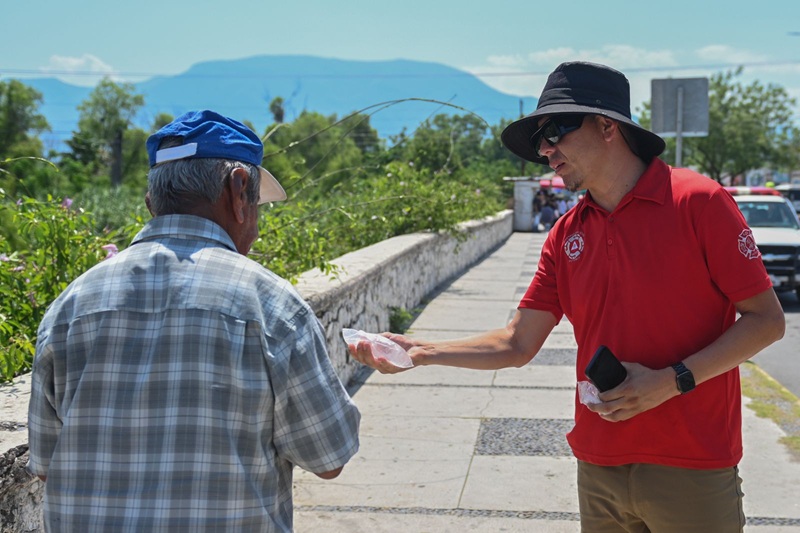 Por instrucción del presidente municipal Eduardo Gattás Báez, personal de la corporación distribuye agua embotellada, suero y brinda atención médica a personas de la tercera edad que por necesidad se exponen a los 42 grados centígrados que se registran en la Capital del Estado.