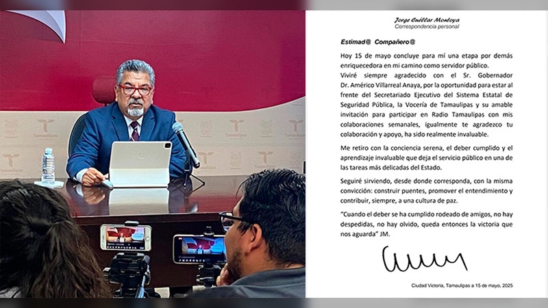“Hoy 15 de mayo concluye lara mi una etapa por demás enriquecedora en mi camino como servidor público. Viviré siempre agradecido con el Sr. Gobernador Dr. Américo Villarreal Anaya, por la oportunidad”, señaló a través de una carta.