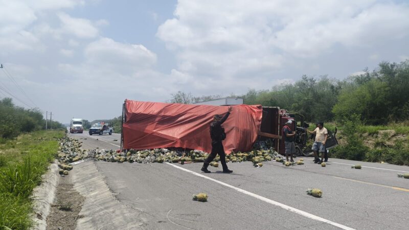 VILLAGRÁN, TAMPS. Debido a la volcadura de un tráiler que transportaba piñas a la altura del kilómetro 102 en el sentido de sur a norte, la circulación se encuentra obstruida en la Carretera Federal 85 Victoria-Monterrey.