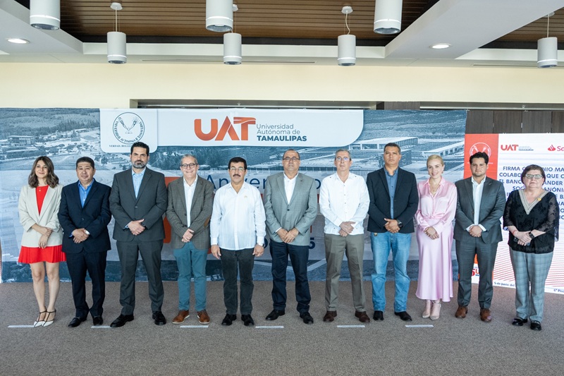 CIUDAD VICTORIA, TAMPS. Con el propósito de consolidar alianzas estratégicas que impulsen el desarrollo académico, tecnológico y social de la comunidad universitaria, la Universidad Autónoma de Tamaulipas (UAT) suscribió el convenio marco de colaboración con Banco Santander México, en una ceremonia encabezada por el rector Dámaso Anaya Alvarado, y el director ejecutivo de Santander Universidades, Arturo Cherbowski Lask.