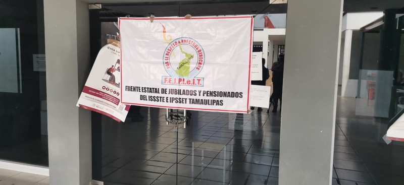 Con algunas lonas, los integrantes del Frente Estatal de la Defensa de la Seguridad Social en el Estado de Tamaulipas hicieron un llamado al director general del ISSSTE, Martí Batres Guadarrama, para exigir un trato digno para trabajadores activos, jubilados y base trabajadora del ISSSTE.
