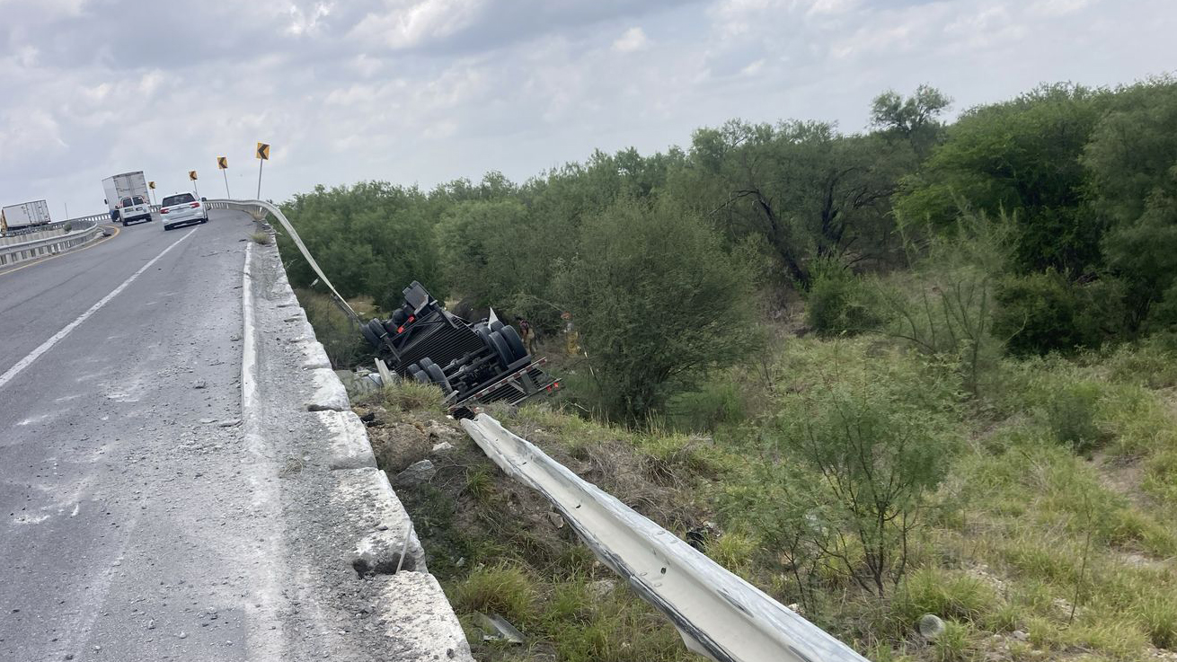 La pesada unidad circulaba de Monterrey hacia la frontera, cuando el tráiler se salió del camino al momento de intentar subir el puente que conduce hacia la vía libre, con el resultado fatal arriba descrito.