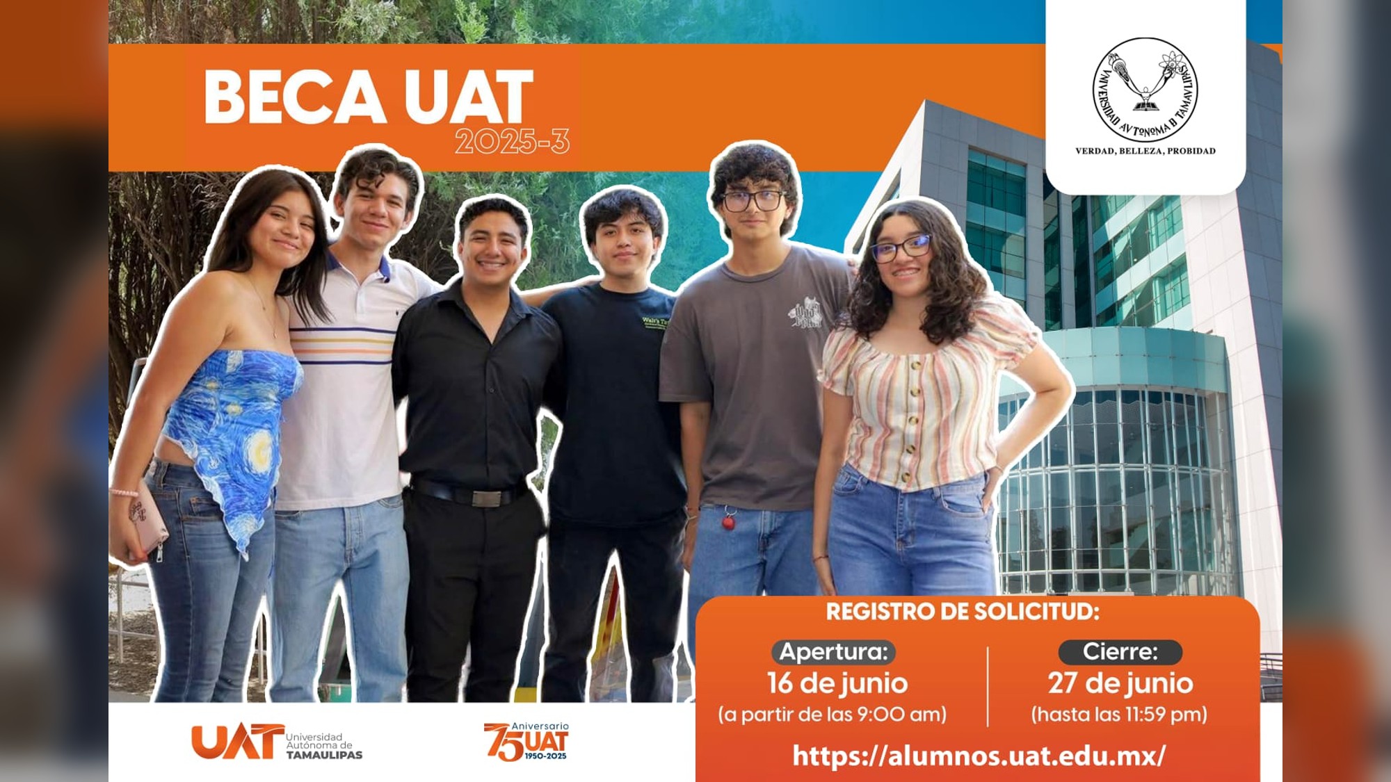 CIUDAD VICTORIA, TAMPS. La Universidad Autónoma de Tamaulipas (UAT) informa que a partir de este lunes 16 de junio se encuentra abierto el proceso de registro para la Beca UAT 2025-3, dirigida a sus estudiantes que participaron en actividades institucionales, deportivas, culturales o humanistas.