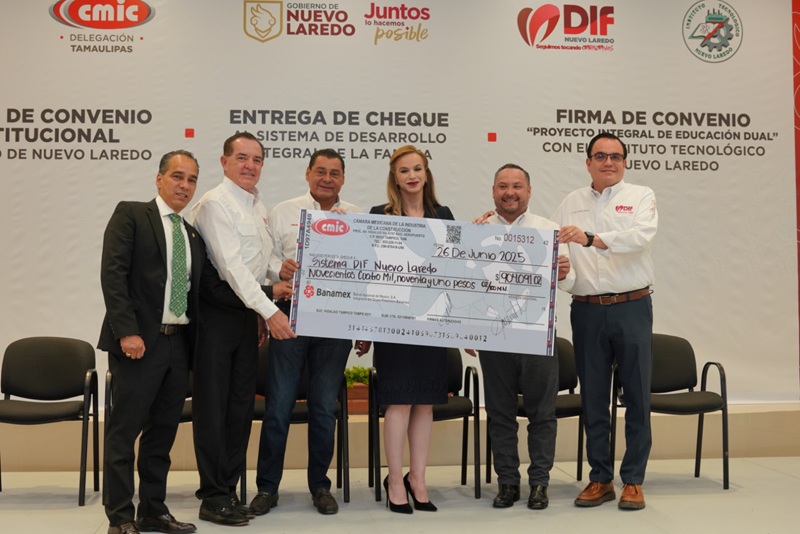 NUEVO LAREDO, TAMPS. En un acto de alta relevancia para el fortalecimiento del desarrollo social y educativo de la ciudad, la Cámara Mexicana de la Industria de la Construcción (CMIC), Delegación Tamaulipas, llevó a cabo la entrega simbólica de un cheque al Sistema DIF Nuevo Laredo, además de formalizar convenios de colaboración con el Gobierno Municipal y el Instituto Tecnológico de Nuevo Laredo.