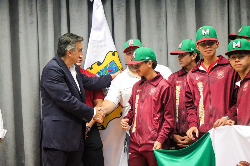 CIUDAD VICTORIA, TAMPS. El gobernador de Tamaulipas, Américo Villarreal Anaya, encabezó la ceremonia de abanderamiento del equipo de la Liga Villa del Refugio de Matamoros A.C., escuadra campeona nacional de la categoría Junior, perteneciente al programa oficial de Little League (Williamsport) y con ello dicho equipo representará a México en el Torneo Latinoamericano, a celebrarse en Guatemala a partir del próximo sábado.