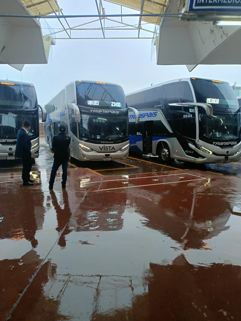 CIUDAD VICTORIA, TAMPS. Más de 15 autobuses que cubrían rutas desde ciudades fronterizas como Reynosa, Matamoros y Monterrey hacia Tampico y El Mante, permanecen varados en la central de autobuses de Ciudad Victoria debido al cierre de carreteras provocado por las intensas lluvias que ha dejado la depresión tropical ‘Barry’ en el estado.