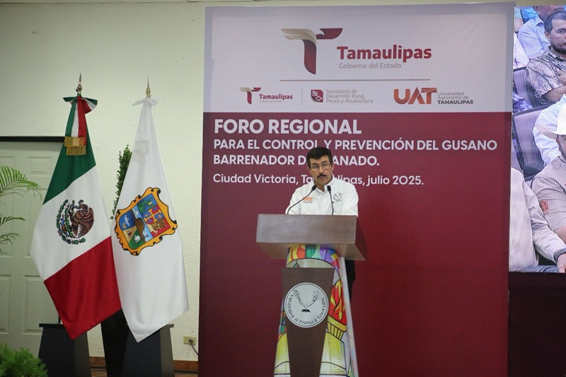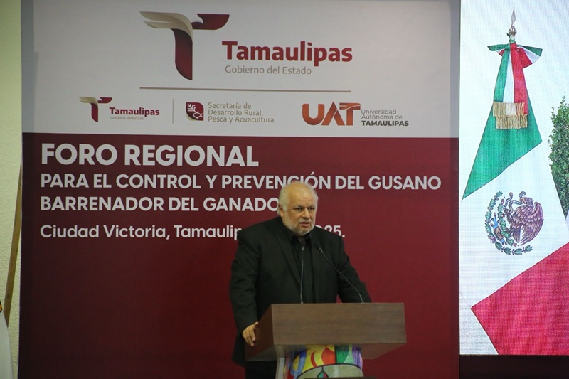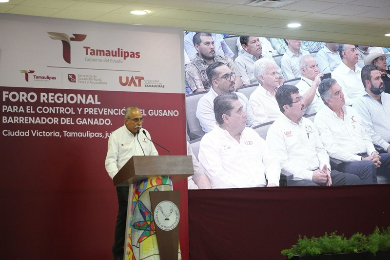 Al presidir el Foro Regional para el Control y Prevención del Gusano Barrenador del Ganado celebrado, la tarde de este viernes, en el Aula Magna de la Facultad de Medicina Veterinaria y Zootecnia de la UAT, el gobernador del Estado reiteró todo el apoyo de su gobierno a las acciones y al trabajo coordinado e interinstitucional para lograr que Tamaulipas mantenga su estatus de estado libre del GBG.