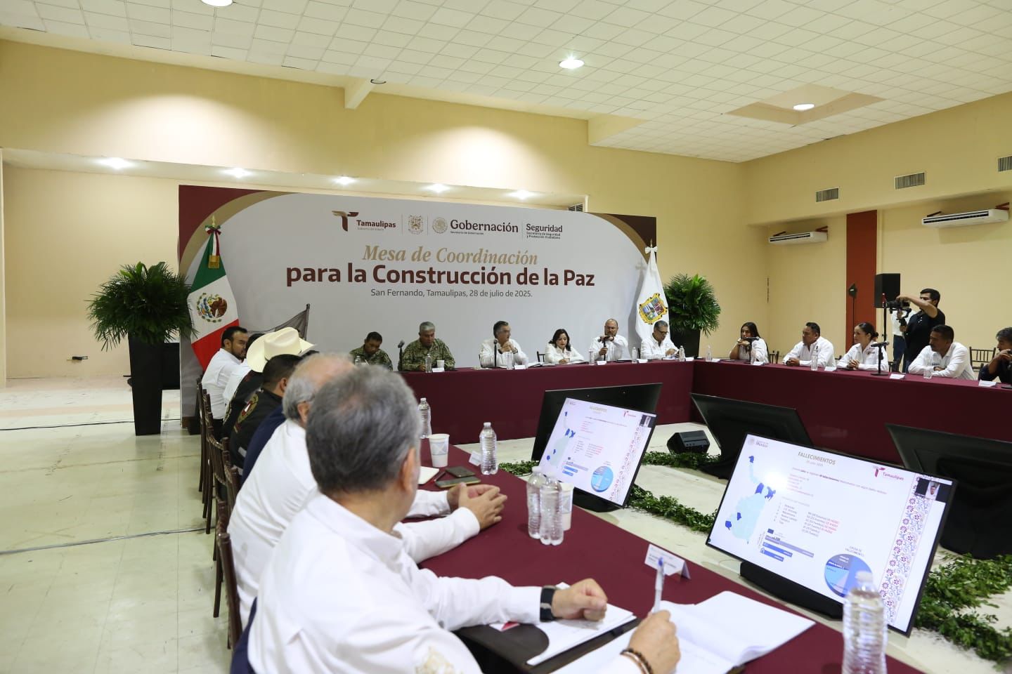Acompañado por el secretario de Seguridad Pública, Carlos Pancardo Escudero, y la presidenta municipal de San Fernando, Verónica Aguirre de los Santos, así como por las y los alcaldes de Soto la Marina, Jiménez, Burgos, Méndez, Abasolo y San Nicolás, el gobernador presidió en el Centro de Convenciones la Mesa de Coordinación para la Construcción de Paz.
