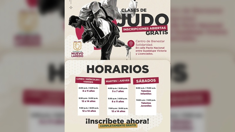NUEVO LAREDO, TAMPS. Con el objetivo de fomentar valores como la disciplina, el respeto y la perseverancia en la niñez y juventud de Nuevo Laredo, el Gobierno Municipal invita a la ciudadanía a inscribir a sus hijas e hijos a las clases gratuitas de judo que iniciarán a partir del 1 de septiembre de 2025 en el Centro de Bienestar Solidaridad.
