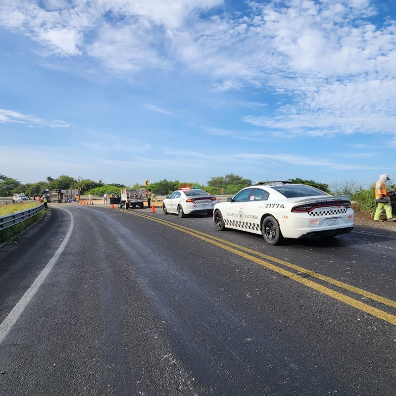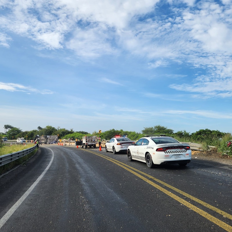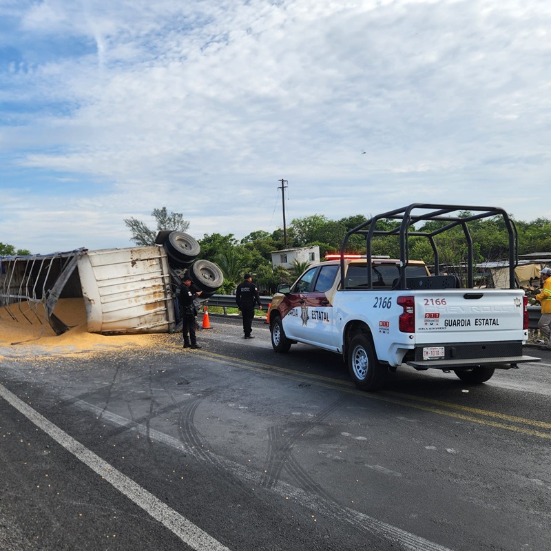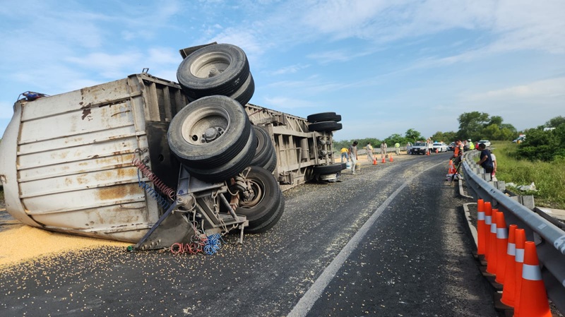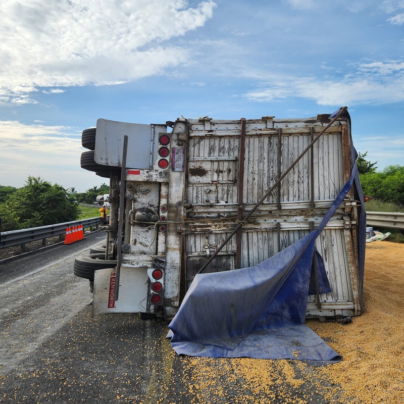 TAMPICO, TAMPS. Derivado de la volcadura de un tractocamión que transportaba maíz sobre la Carretera Federal 70 Maxilibramiento Tampico, la circulación se encuentra cerrada en ambos sentidos a la altura del kilómetro 8.