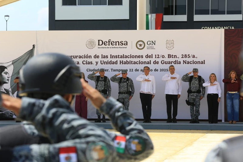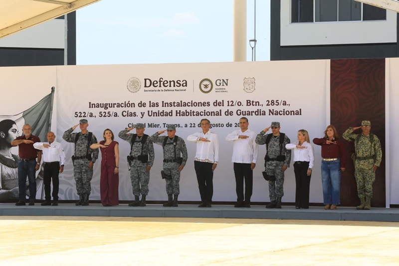 CIUDAD MIER, TAMPS. El gobernador Américo Villarreal Anaya, acompañado por el comandante de la Guardia Nacional, general Hernán Cortés Hernández, inauguró las instalaciones del 12° Batallón, 3 compañías y una unidad habitacional de la Guardia Nacional en esta ciudad, a fin de fortalecer la capacidad institucional y reforzar la presencia de la corporación para brindar mayor seguridad a las y los tamaulipecos de esta región del estado.