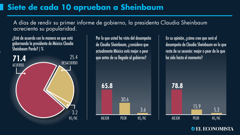 CIUDAD DE MÉXICO. 7 de cada 10 personas está de acuerdo con la manera en que está gobernando Claudia Sheinbaum al país hasta agosto de este año y de cara a rendir su primer informe de gobierno.