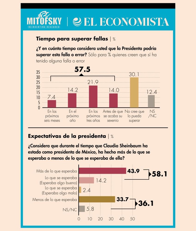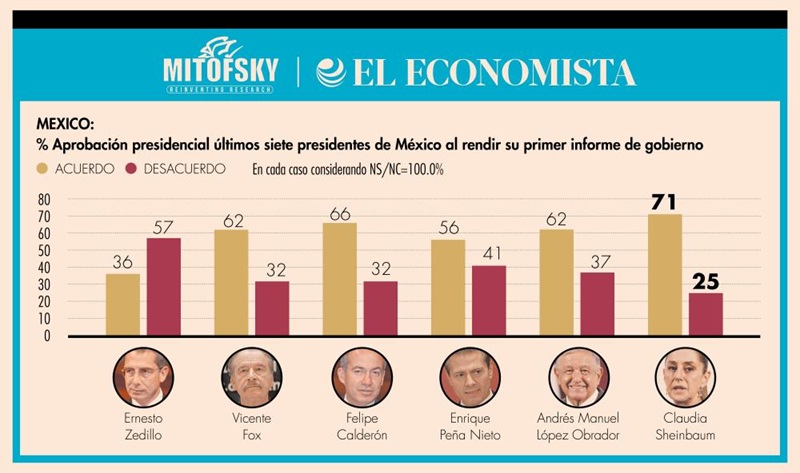 Por otro lado, la encuesta también reveló que el nivel de aprobación de Sheinbaum se encuentra por arriba de los últimos presidentes de cara a rendir su primer informe de gobierno. Con su antecesor, la diferencia es de 9 puntos, pues en ese momento el aval de Andrés Manuel López Obrador era de 62% por ciento.
