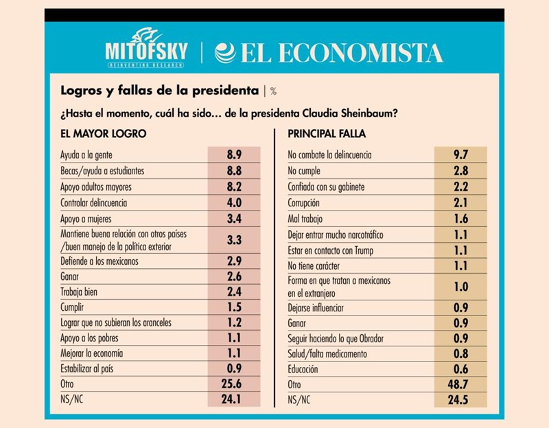 Para los entrevistados, el mayor logro hasta el momento de la presidenta es la ayuda a la gente, con 8.9%, mientras que la principal falla es no combatir a la delincuencia.