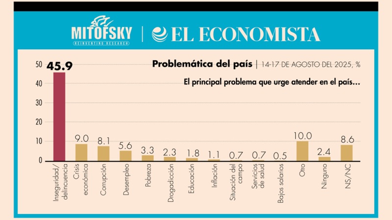 De acuerdo con una encuesta elaborada por Mitofsky para El Economista, de 1,000 personas consultadas, 45.9% respondió que la inseguridad/delincuencia es el principal problema que urge atender en el país.