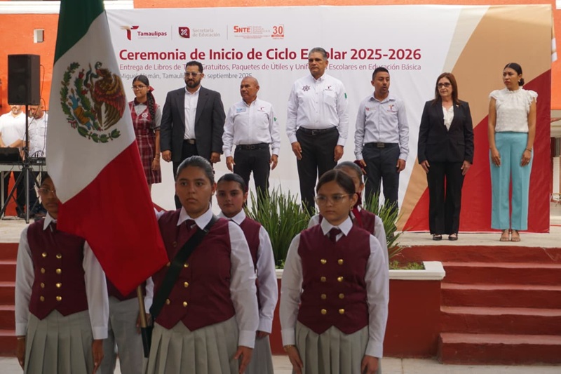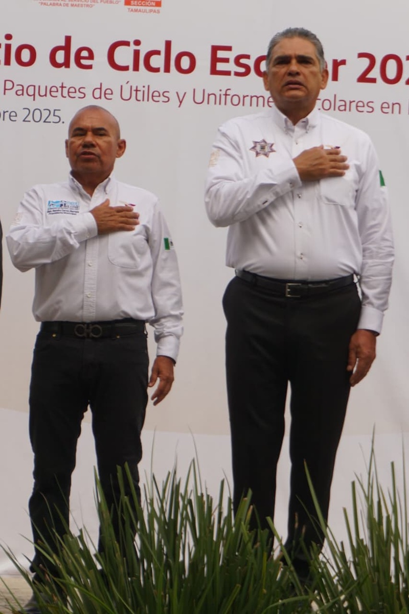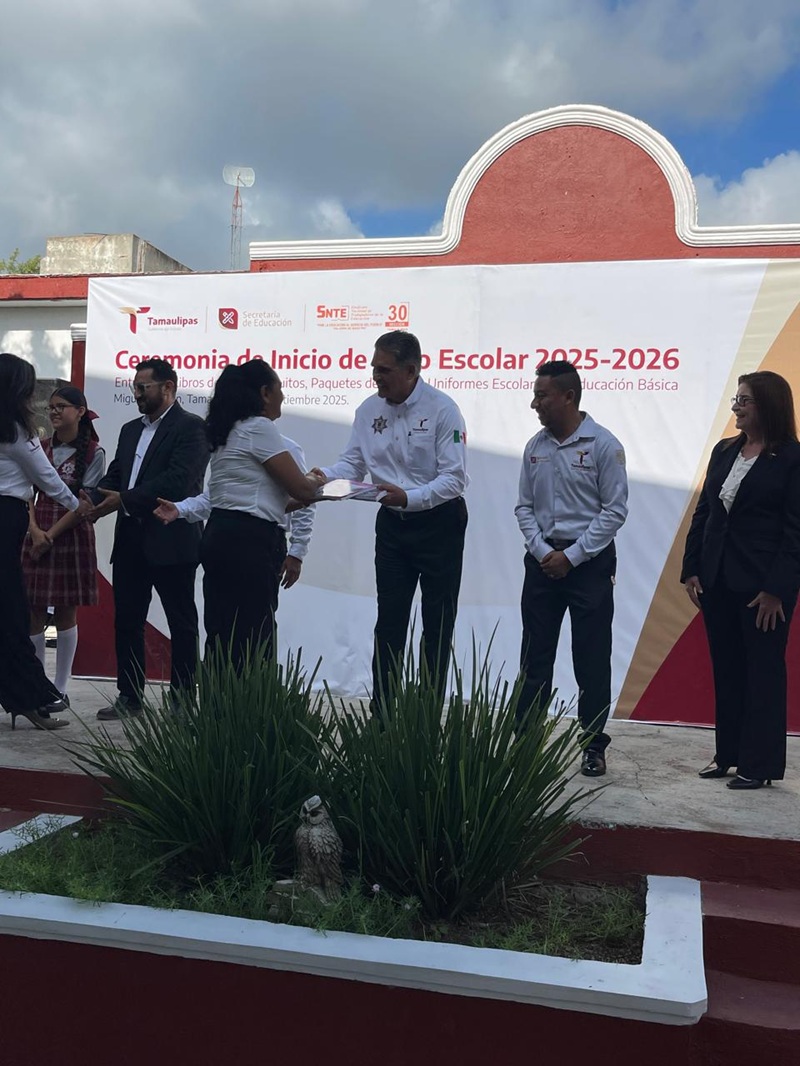 MIGUEL ALEMÁN, TAMPS. En representación del gobernador Américo Villarreal Anaya, el secretario de Seguridad Pública de Tamaulipas, Carlos Arturo Pancardo Escudero encabezó la ceremonia de inauguración del ciclo escolar 2025-2026 celebrada en la Escuela Secundaria Técnica 49 “Wilfrido Massieu”, ubicada en el municipio de Miguel Alemán.