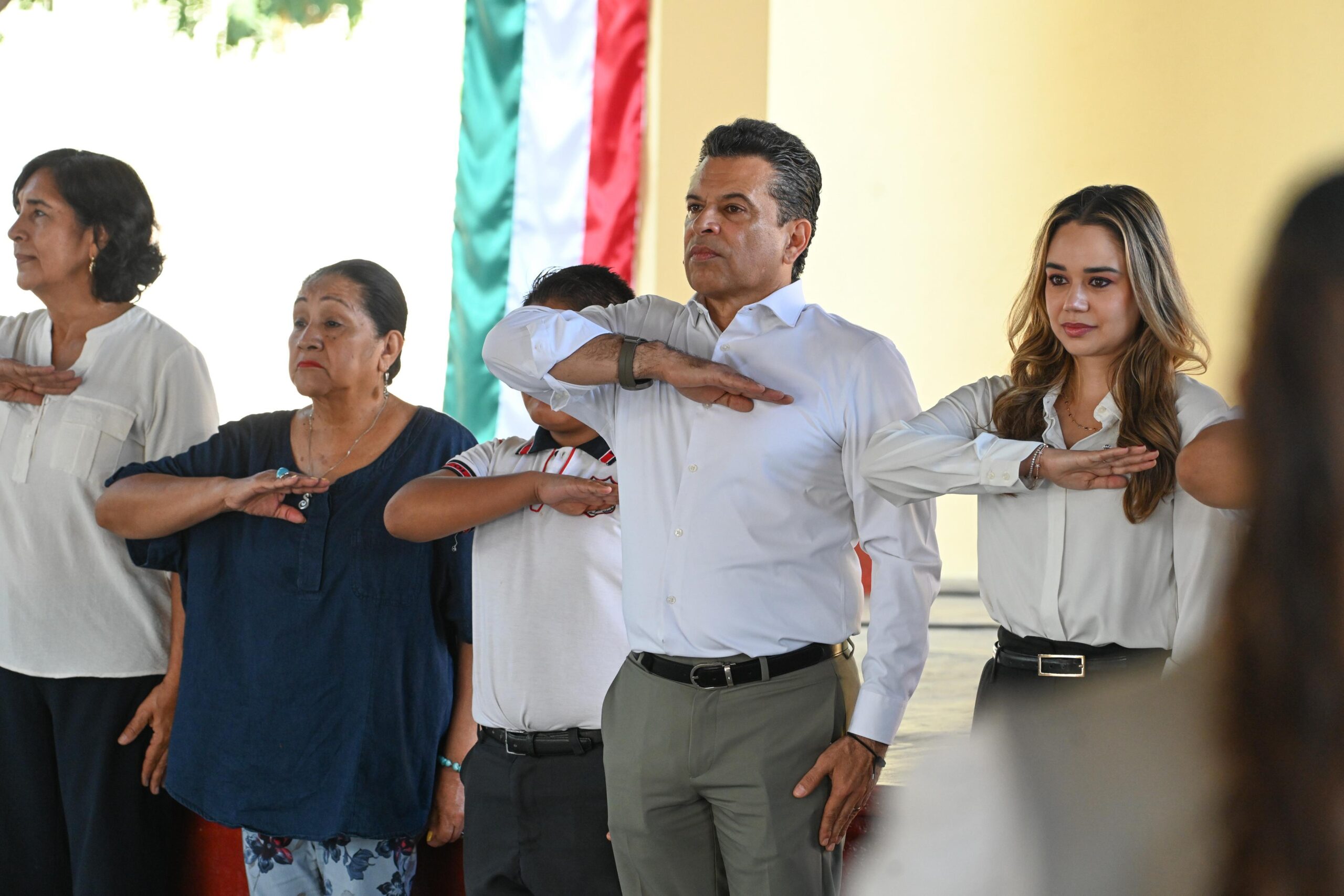 Con honores a la bandera de México y Tamaulipas, presidió el acto protocolario en compañía de autoridades educativas y comunidad escolar, ante quienes reiteró en su mensaje el compromiso de su gobierno municipal de seguir invirtiendo en la dignificación de espacios donde se fortalezca la educación de la niñez de la Capital de Tamaulipas.