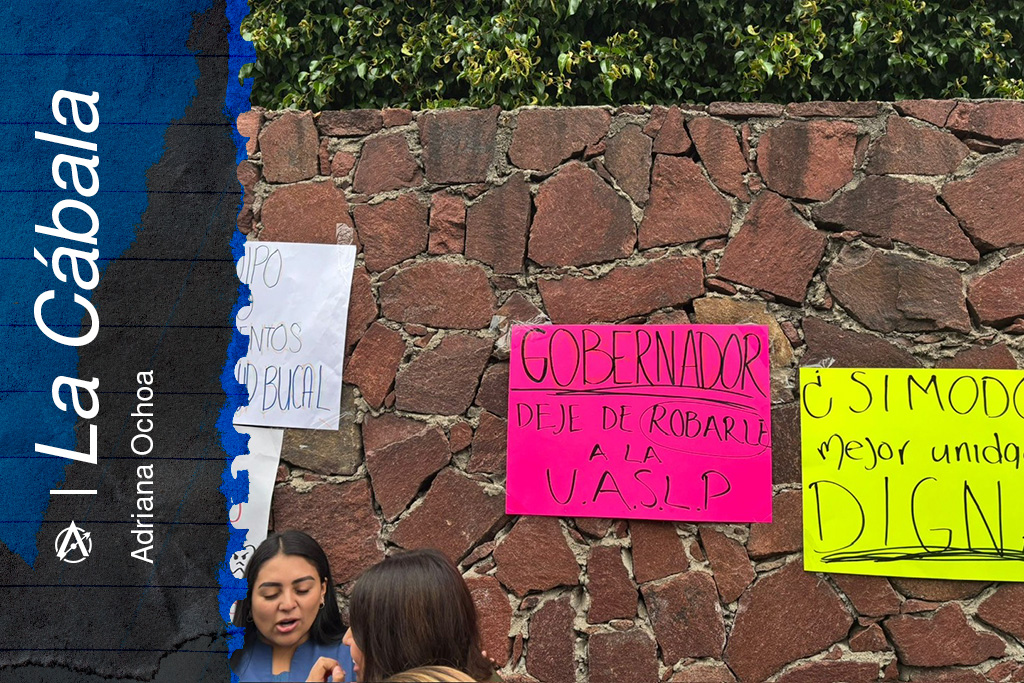 En el muro de piedra de la Facultad de Estomatología de la UASLP, junto a otras cartulinas, entre coloridas y blancas, una en rosa fosfo, llamativa como un grito: “Gobernador deje de robarle a la UASLP”.