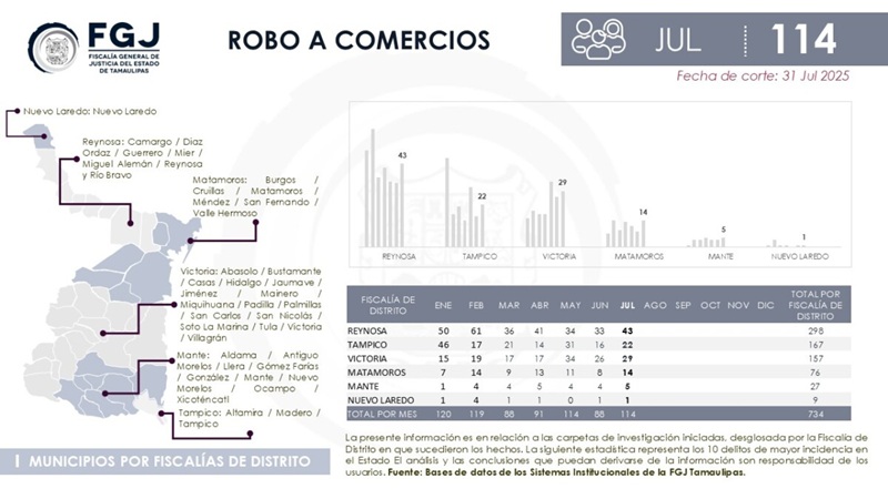 En cuanto al robo a comercios se refiere, Reynosa también encabeza la estadística con 298 casos de enero a julio de este año. Le sigue Tampico, con 167 casos; Ciudad Victoria, con 157; Matamoros, 76; Mante, 27, y Nuevo Laredo, 9 casos reportados.