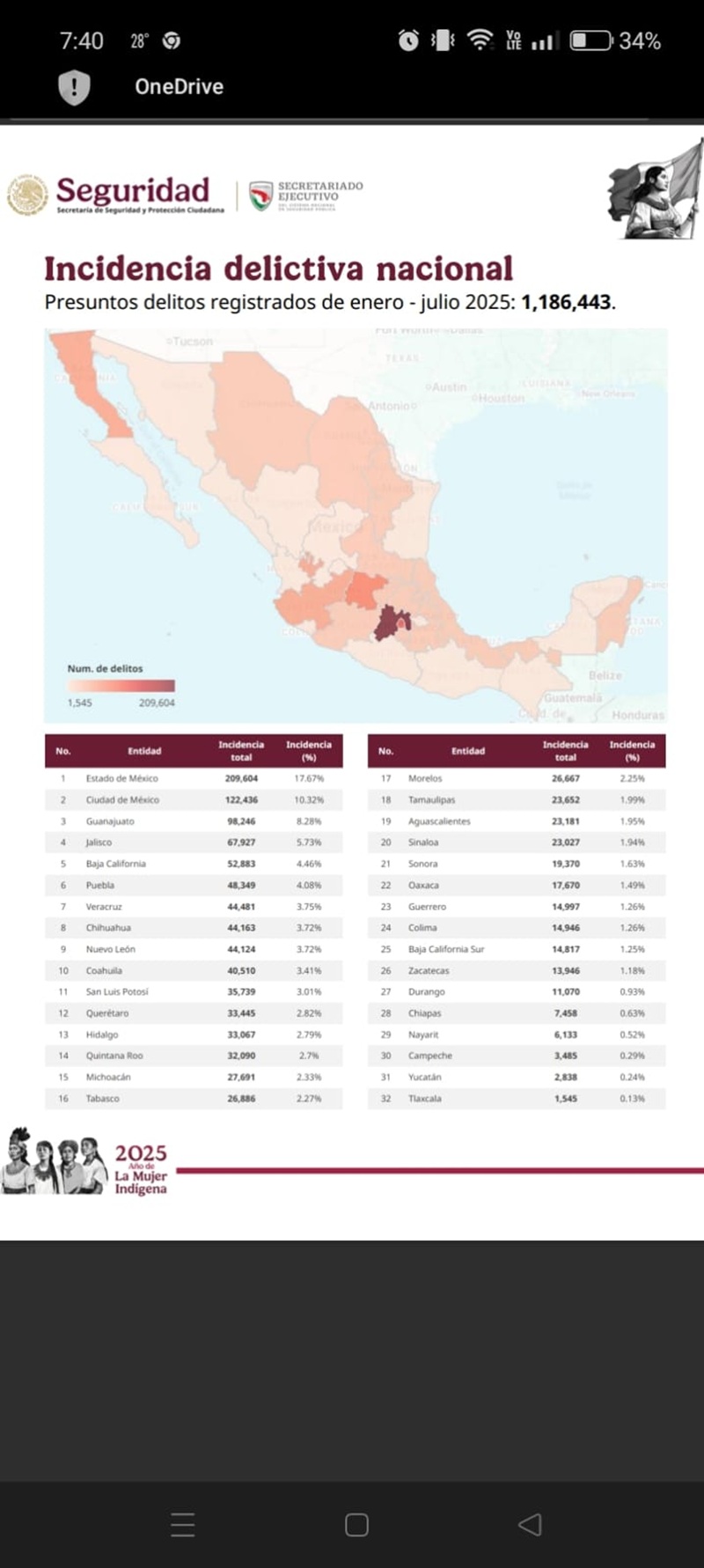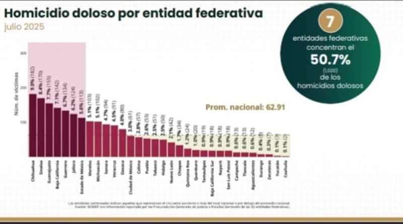 De acuerdo con cifras de la dependencia de justicia federal, Tamaulipas cerró el primer semestre de 2025 con una disminución del 50.4% en homicidios dolosos en comparación con el mismo periodo de 2024.