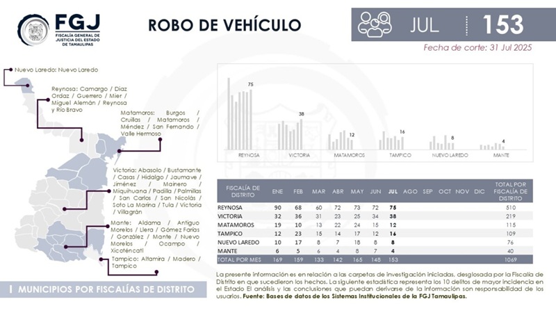 - En Reynosa, de enero a julio de este 2025, se reportaron 510 vehículos robados.