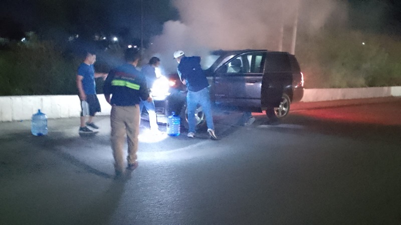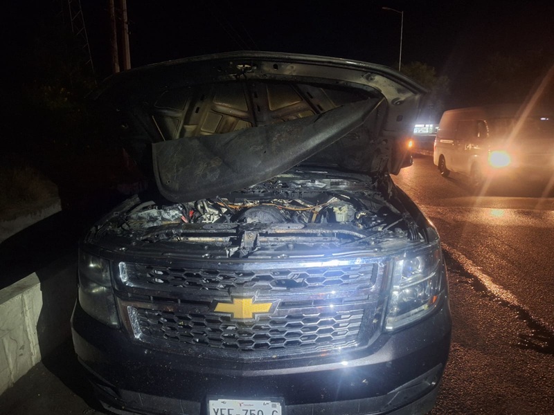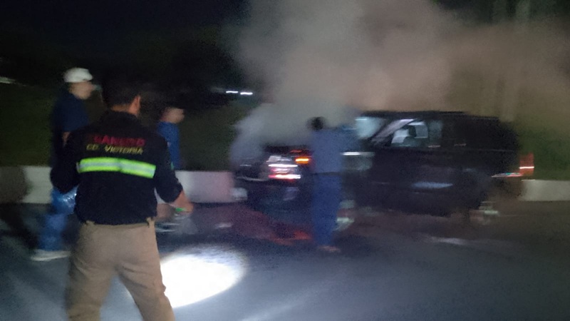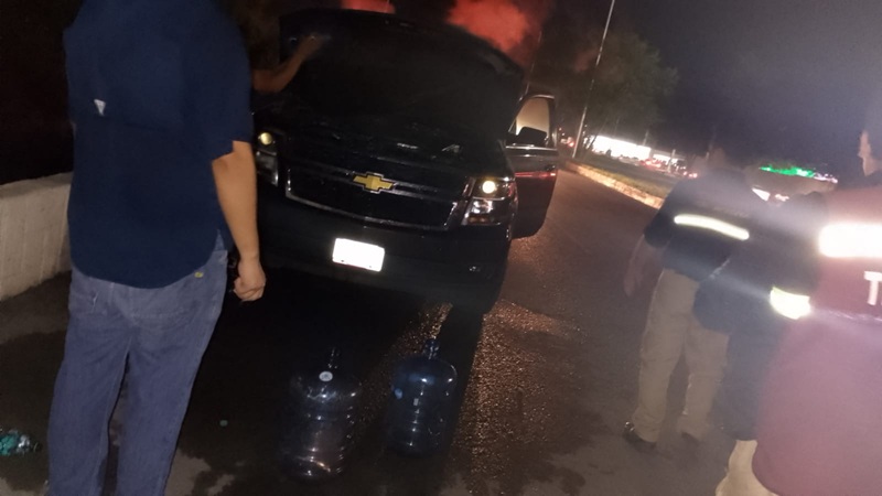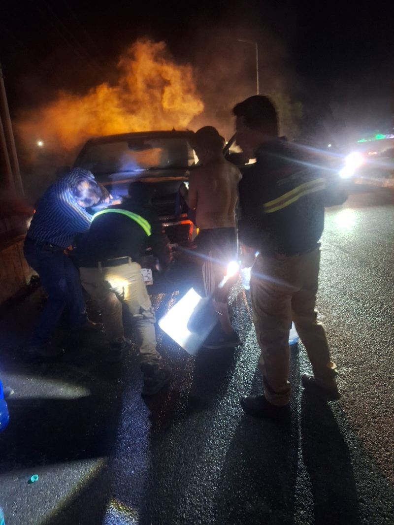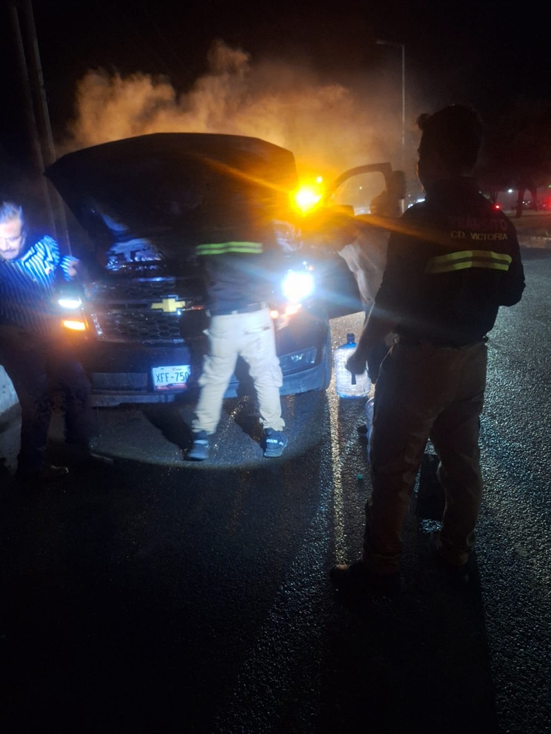 CIUDAD VICTORIA, TAMPS. En un recorrido de vigilancia permanente, los elementos de tránsito local de la unidad 75 se percataron que una camioneta se empezó a incendiar la noche de este miércoles, por lo que ayudaron al conductor a ponerse a salvo y apagar el fuego con garrafones de agua y con palas de tierra.