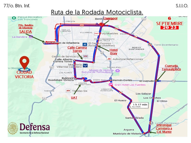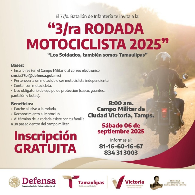 CIUDAD VICTORIA, TAMPS. La Secretaría de la Defensa Nacional, a través del 77 Batallón de Infantería, en coordinación con la Presidencia Municipal de Victoria anunció la Tercera Rodada Motociclista 2025 ‘Los Soldados También Somos Tamaulipas’ para este sábado 6 de septiembre.