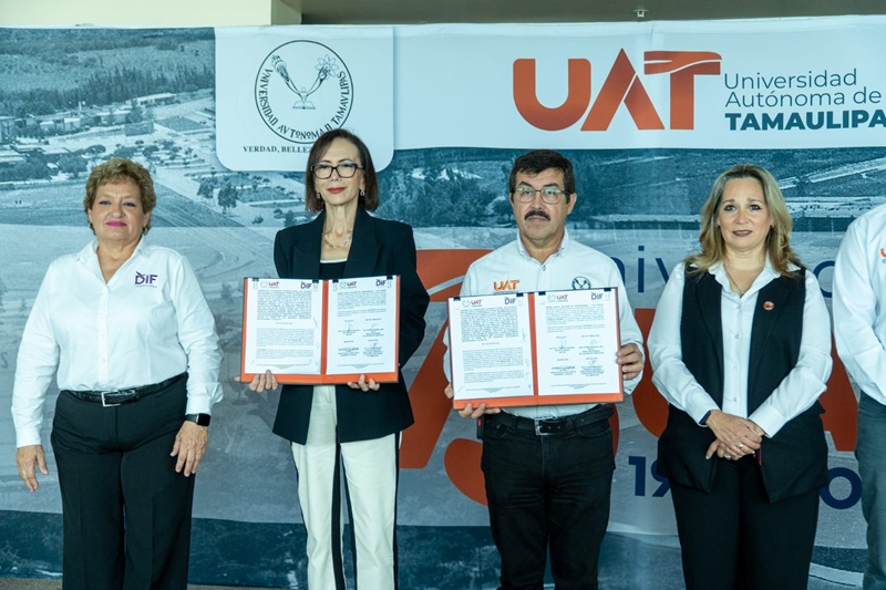 El rector Dámaso Anaya Alvarado firmó el acuerdo con la directora general del Sistema DIF Tamaulipas, Patricia Eugenia Lara Ayala, teniendo como testigo de honor a la directora general del Instituto Tamaulipeco de Capacitación para el Empleo (ITACE), Claudia Anaya Alvarado.