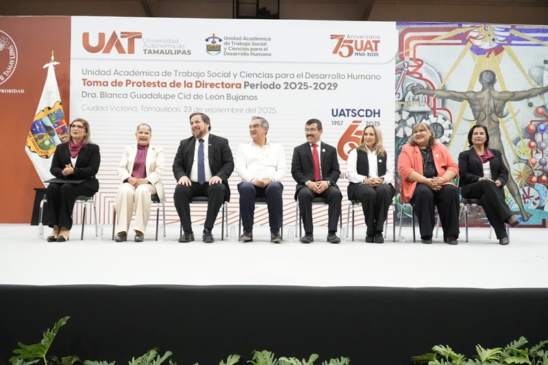 CIUDAD VICTORIA, TAMPS. Teniendo como testigo de honor al gobernador Américo Villarreal Anaya, el rector de la Universidad Autónoma de Tamaulipas (UAT), Dámaso Anaya Alvarado, le tomó protesta a la nueva directora de la Unidad Académica de Trabajo Social y Ciencias para el Desarrollo Humano (UATSCDH), Dra. Blanca Guadalupe Cid de León Bujanos, quien asume el cargo para el periodo 2025-2029.