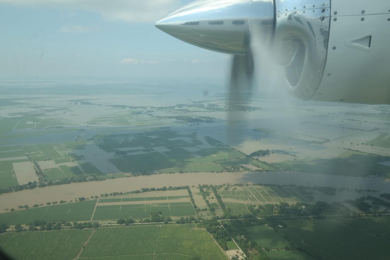 La tarde de este viernes, a bordo del avión «Tláloc» y acompañado por Raúl Quiroga Álvarez, secretario de Recursos Hidráulicos, el ejecutivo tamaulipeco recorrió las márgenes del Pánuco, hasta el municipio de Tamuín, San Luis Potosí, en donde constató las afectaciones a diversas comunidades rurales a causa del desbordamiento del río.