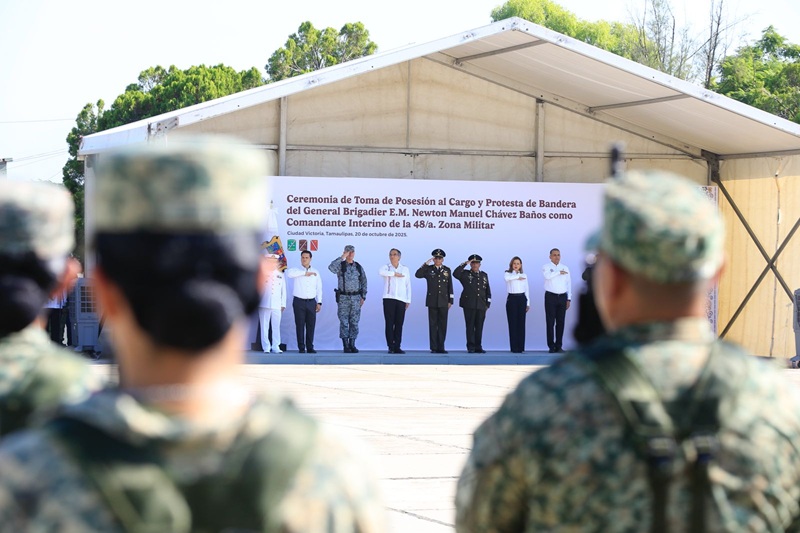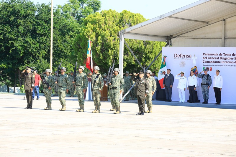 CIUDAD VICTORIA, TAMPS. El gobernador Américo Villarreal Anaya asistió como invitado de honor a la toma de posesión al cargo y protesta de bandera del general brigadier de Estado Mayor, Newton Manuel Chávez Baños, como comandante interino de la 48 Zona Militar.