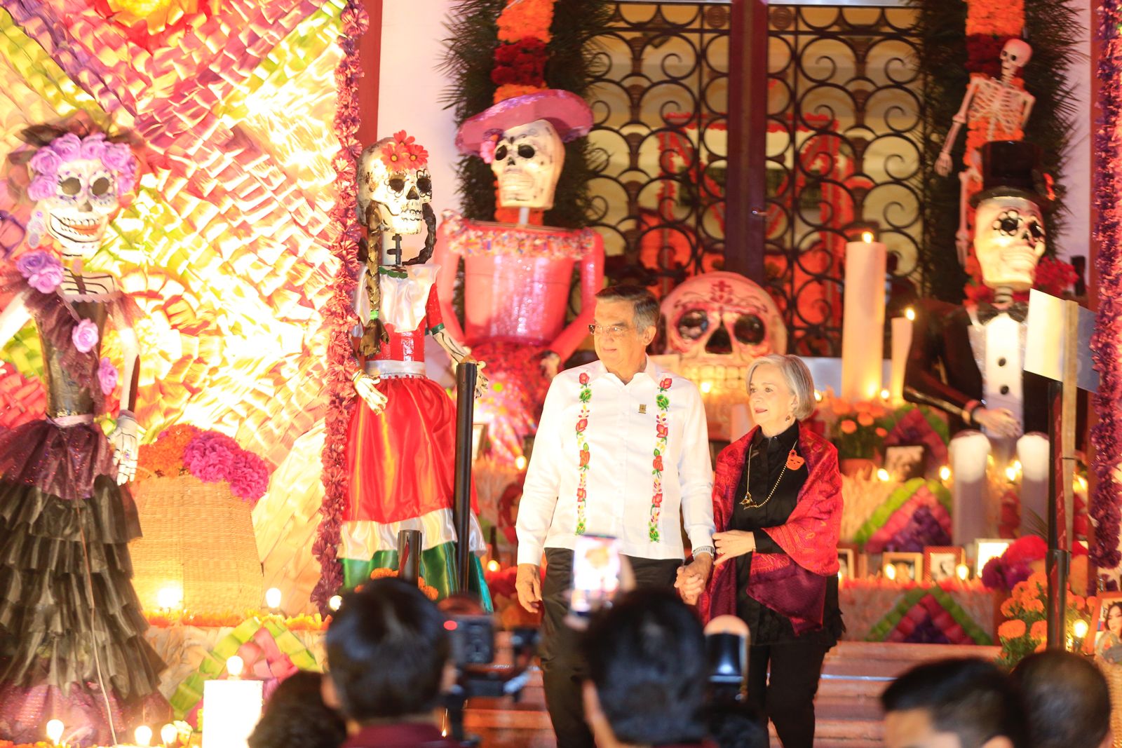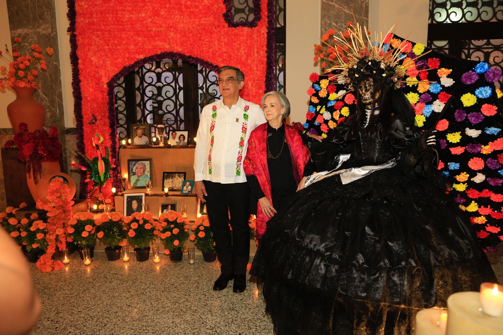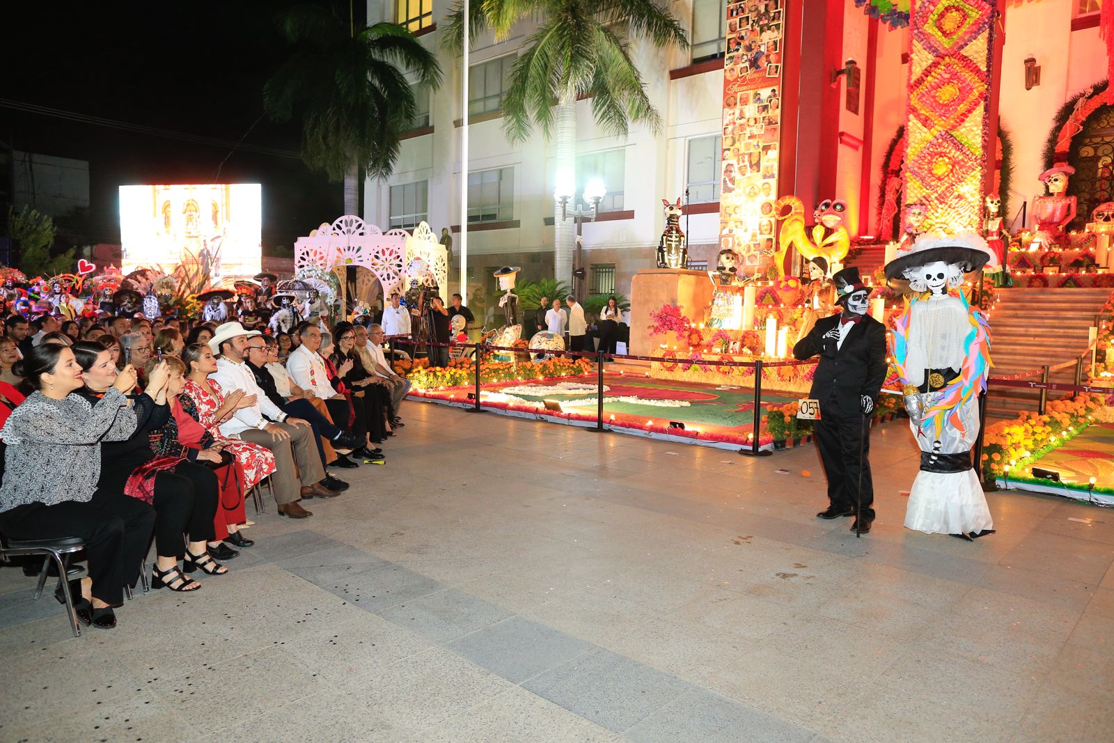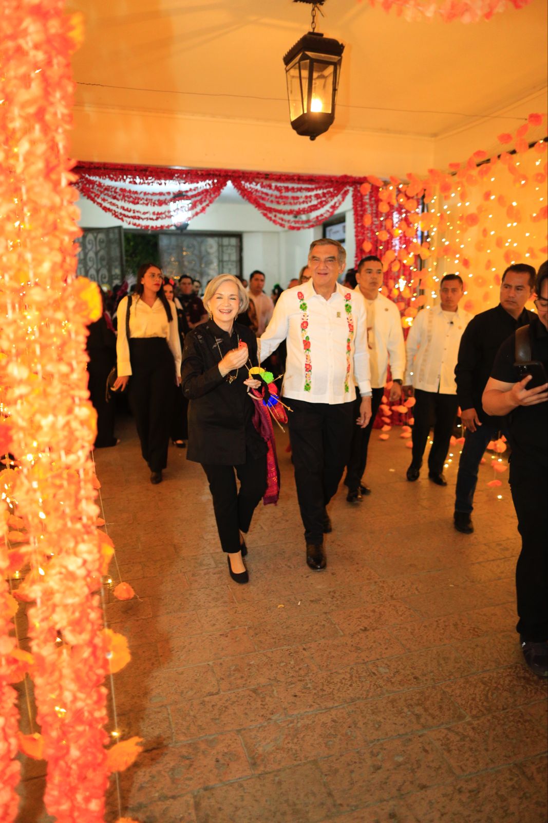 CIUDAD VICTORIA, TAMPS. En un ambiente impregnado por el aroma de la flor de cempasúchil, el pan de muerto y las luces de las velas, el gobernador Américo Villarreal Anaya y la presidenta del Sistema DIF Estatal, María de Villarreal presidieron la premiación del concurso estatal de catrinas y catrines «Almas Tamaulipecas» y la muestra del altar monumental del Día de Muertos en las escalinatas de Palacio de Gobierno .