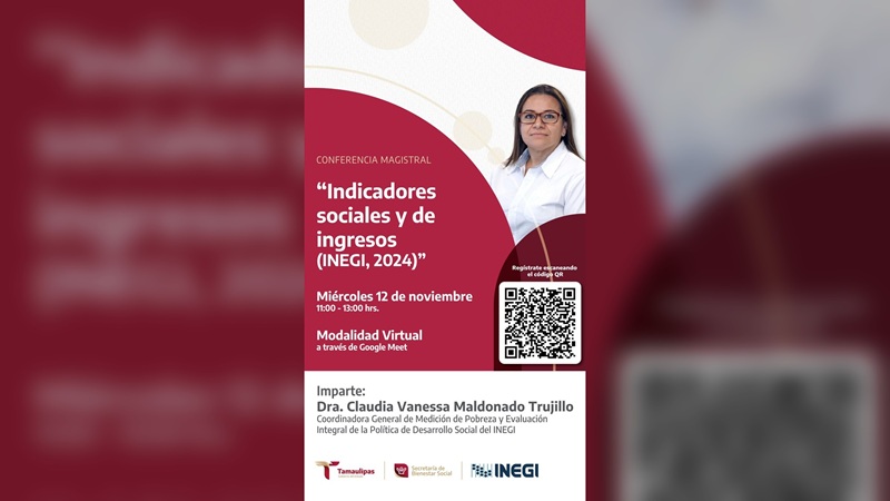 CIUDAD VICTORIA, TAMPS. La videoconferencia magistral “Indicadores Sociales y de Ingresos (INEGI, 2024)”, será dictada por la Dra. Claudia Vanessa Maldonado Trujillo, coordinadora general de Medición de Pobreza y Evaluación Integral de la Política de Desarrollo Social del INEGI, el próximo miércoles 12 de noviembre, informó la secretaria de Bienestar Social Silvia Casas González.