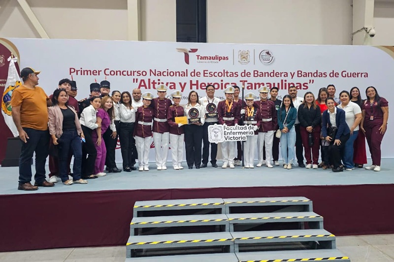 CIUDAD VICTORIA, TAMPS. Con gran orgullo institucional, la Facultad de Enfermería Victoria de la Universidad Autónoma de Tamaulipas (UAT) obtuvo el primer lugar en las categorías Nivel Superior y Libre del Primer Concurso Nacional de Bandas de Guerra y Escoltas de Bandera “Altiva y Heroica Tamaulipas”, organizado por el Gobierno del Estado y celebrado este 8 de noviembre en el Polyforum de Ciudad Victoria.