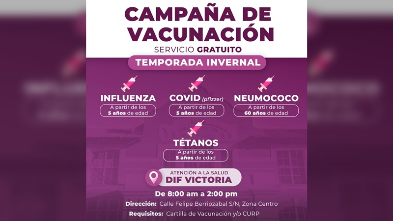 CIUDAD VICTORIA, TAMPS. Con el propósito de cuidar la salud de las familias victorenses durante la temporada invernal, el Sistema DIF Victoria y su Presidenta Lucy de Gattás, invita a la población a participar en su ‘Campaña de Vacunación Gratuita’, disponible en el área de Atención a la Salud.