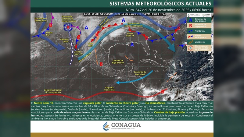 En regiones del occidente, centro, oriente y sur, la presencia de canales de baja presión y el ingreso de humedad seguirán generando lluvias y chubascos en estados del centro y sureste, incluida la Península de Yucatán. El ambiente muy frío persistirá al amanecer en la Mesa del Norte y Mesa Central, con heladas en zonas serranas.