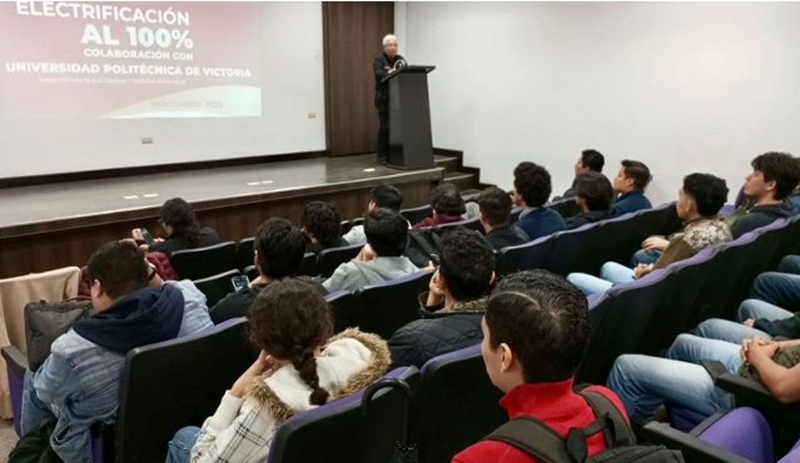 CIUDAD VICTORIA, TAMPS. En el marco de las reuniones realizadas para el proyecto Electrificación al 100%, cuyo objetivo es promover la colaboración de estudiantes de la UPV, el subsecretario de Electricidad y Energías Renovables, Roberto Manuel Rendón Mares, acompañado por el director de Industria Eléctrica, Luis Esteban Igartua, y la directora de Energías Renovables, Elizabeth Martínez Saldaña, presentó ante alumnos de las carreras de Manufactura Avanzada y Mecatrónica los detalles del proyecto, además de invitarles a integrarse a su ejecución durante sus próximos periodos de estadías y estancias, programados para iniciar en enero de 2026.