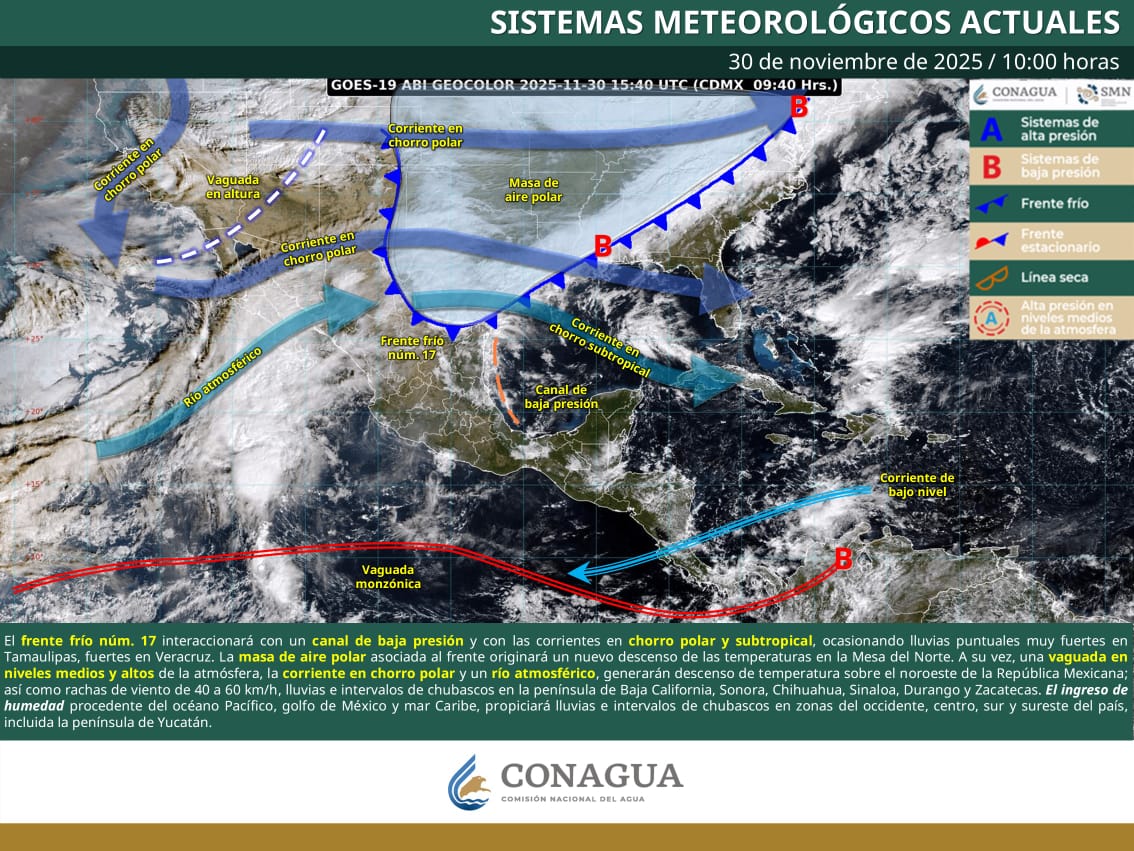 Este domingo 30 de noviembre marca también el fin de la temporada de ciclones tropicales; sin embargo, el SMN recordó que la vigilancia atmosférica continuará debido a la presencia de frentes fríos y sistemas invernales que seguirán afectando al país en las próximas semanas