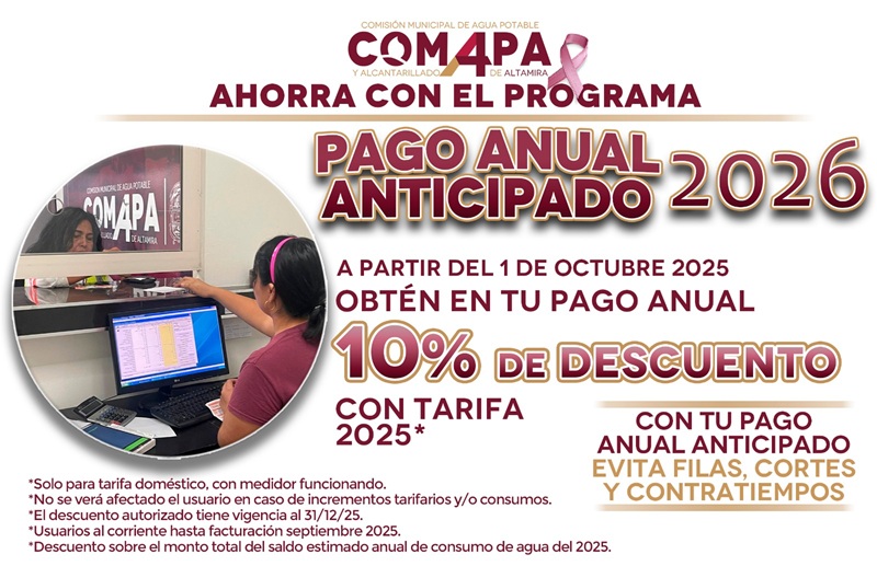 Brindando soluciones accesibles y prácticas en beneficio de las familias altamirenses, el organismo ofrece el ‘Pago Anual 2026’ y el ‘Pago Anual Anticipado’; en el primero, se invita a los usuarios que cuentan con medidor y han tenido un comportamiento cumplido y ordenado para que puedan hacer su pago de manera anticipada con un descuento.