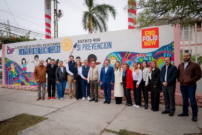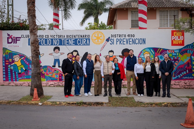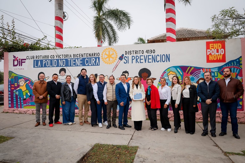 CIUDAD VICTORIA, TAMPS. El DIF Victoria, encabezado por su presidenta Lucy de Gattás, presentó en sus instalaciones el mural “End Polio Now”, realizado en colaboración con el Club Rotario Ciudad Victoria Bicentenario como parte de la campaña global de sensibilización sobre la importancia de la prevención y la vacunación contra la poliomielitis.