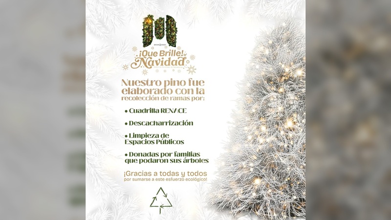 El pino fue elaborado a partir de ramas recolectadas por cuadrillas de limpieza, campañas de descacharrización y familias que realizaron la poda de sus árboles, sumándose a un esfuerzo colectivo para celebrar una Navidad sustentable y responsable, para que brille Matamoros.