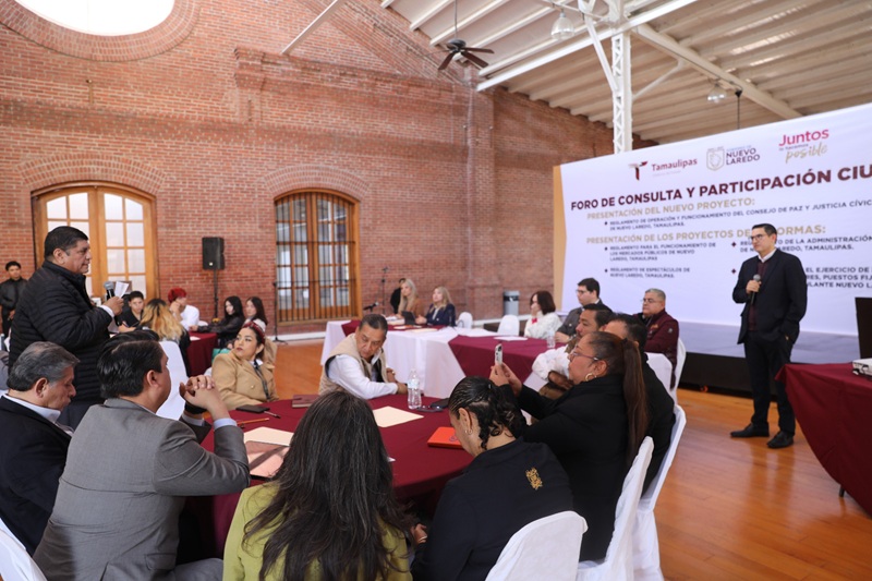 NUEVO LAREDO, TAMPS. El Gobierno Municipal de Nuevo Laredo llevó a cabo el Foro de Consulta Ciudadana con el propósito de presentar a la población la actualización del marco legal municipal, mediante la creación y reforma de diversos reglamentos que rigen servicios, actividades y estructuras administrativas en la ciudad.