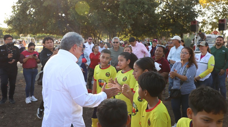 Durante la visita, el presidente municipal destacó que este espacio deportivo fue rehabilitado con la colocación de porterías nuevas, así como la instalación de alumbrado público, lo que permitirá a niñas, niños, jóvenes y adultos practicar deporte en mejores condiciones y con mayor seguridad.