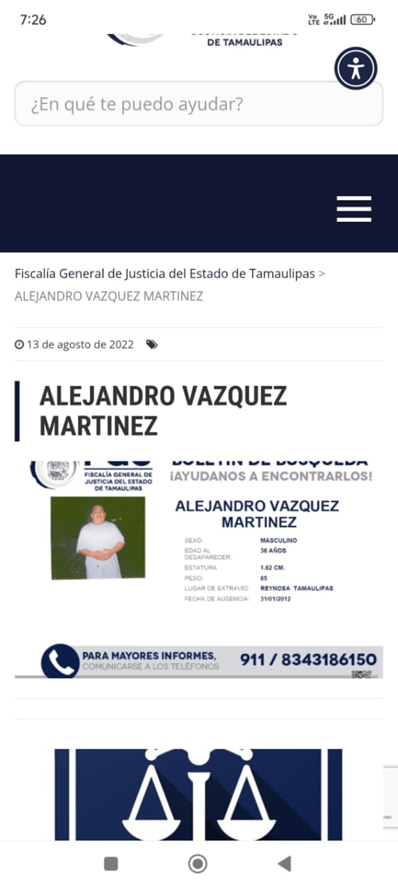 De acuerdo con el reporte oficial, Alejandro Vázquez tenía 36 años de edad, medía 1.62 metros y pesaba aproximadamente 85 kilogramos cuando fue reportado como desaparecido en Reynosa.